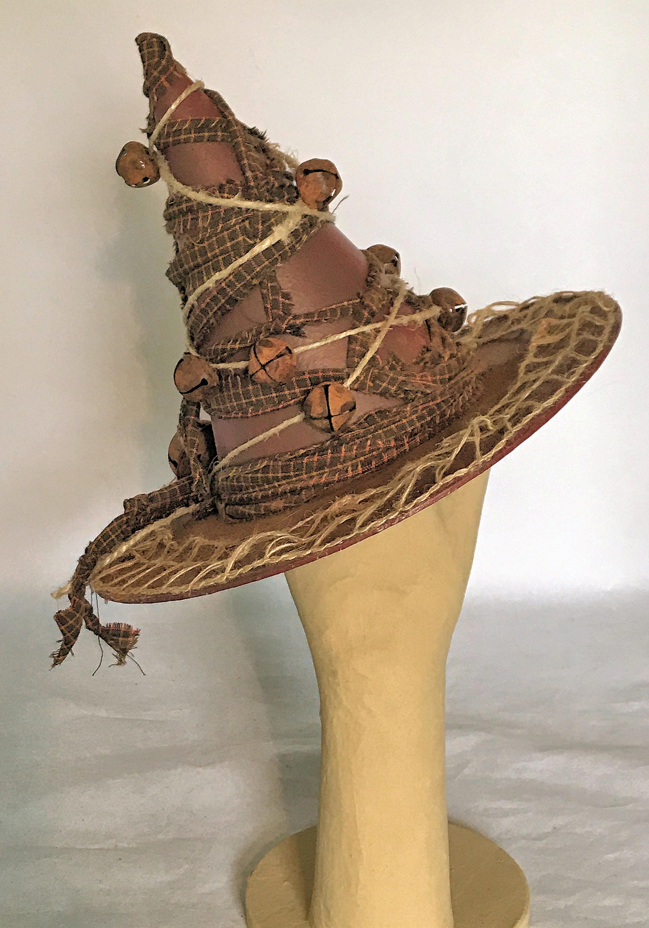 This hat has been painted a rich spice red, accented with brown, wrapped with a brown homespun, covered with jute cord and rusty bells and jute ribbon. The homespun is tied in a bow with a larger rusty bell for accent.