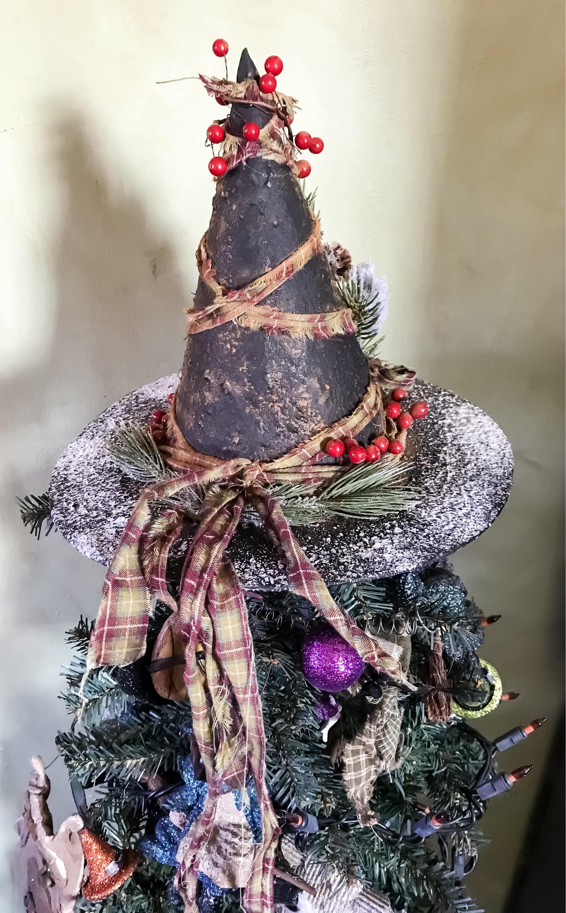Give your tree a distinct look with this primitive witch hat tree topper.