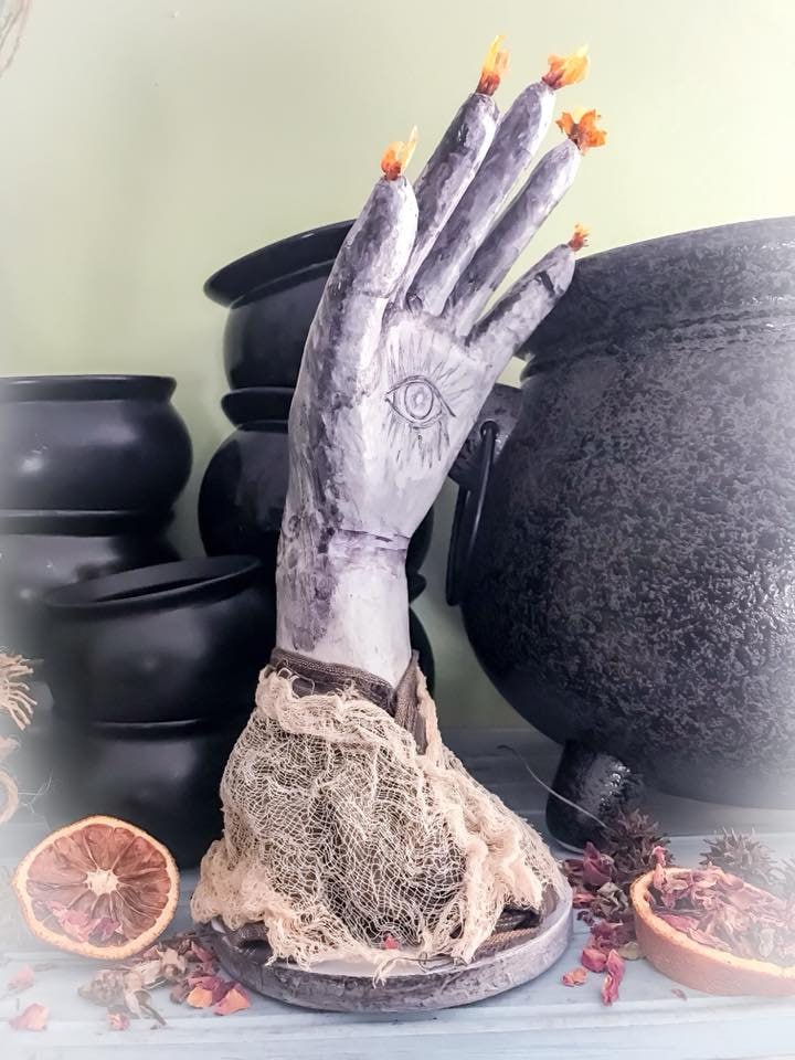 I've created this lovely decor with a paper mache hand, painted in gray with gold celestial accents. I made a cross between the mystal eye in hand and the glory hand with the flaming fingertips. The fingernails are painted in silver, with silver scrollwork enhancing the celestial paints on the back of the hand. The eye in the palm is created with ink and neatly applied with a primitive look. I've created flames on the fingertips with painted tissue paper.