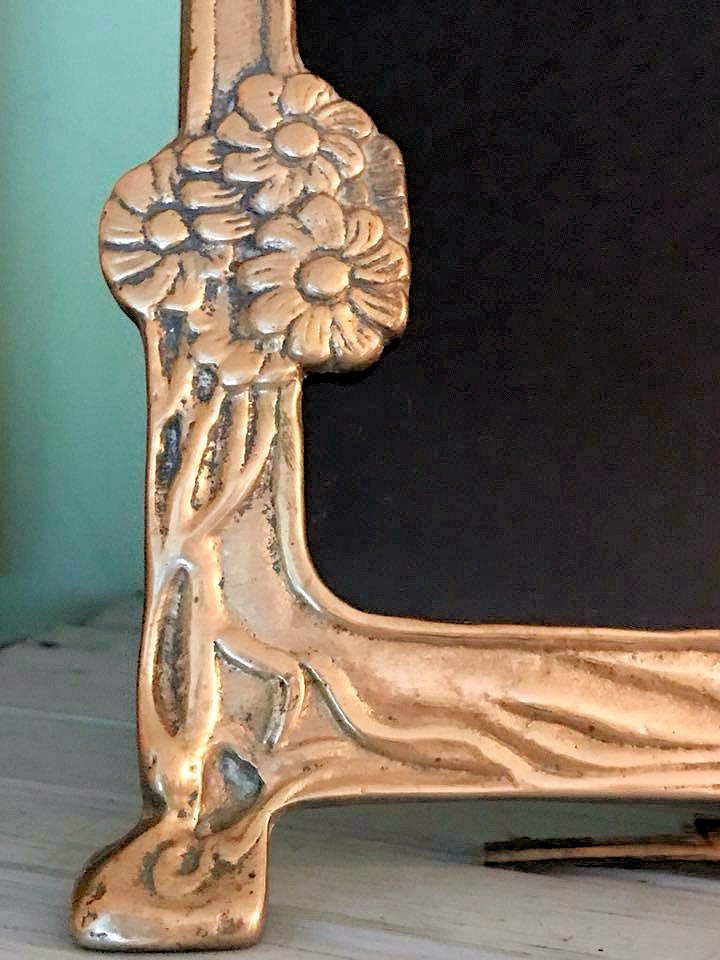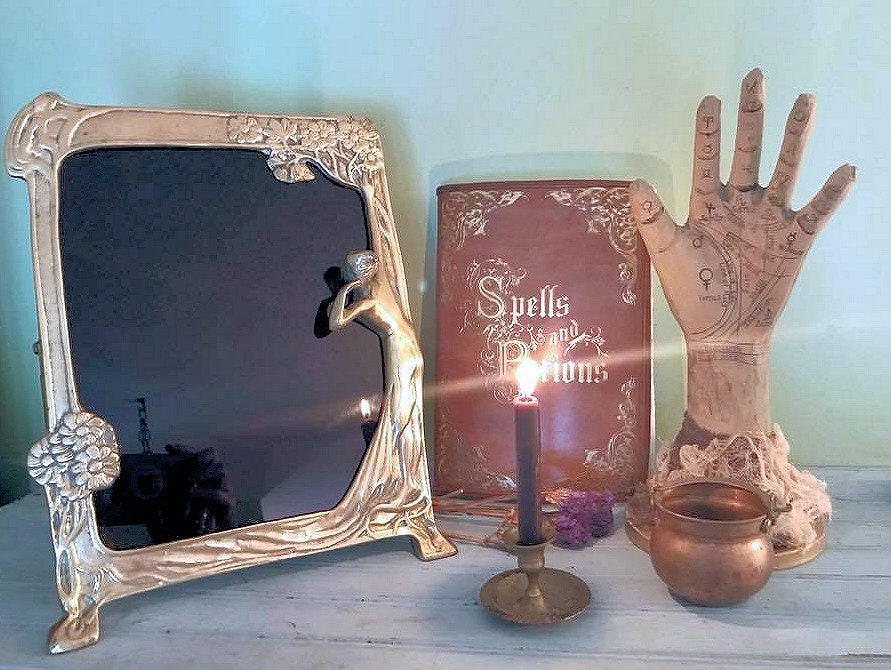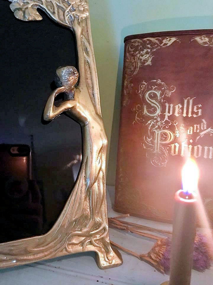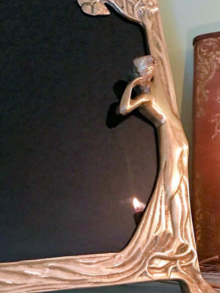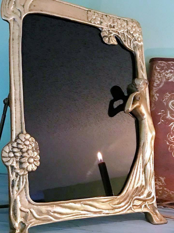 This is a beautiful scrying mirror that I have crafted from a Victorian Art Nouveau large brass mirror. The brass has a small bit of patina, but overall is in great condition for its age. It features a young girl looking around a tree into the blackness of the mirror, standing on the roots of the tree. The other side has a few flowers and design. It has the original brass bar easel for easy standing.
