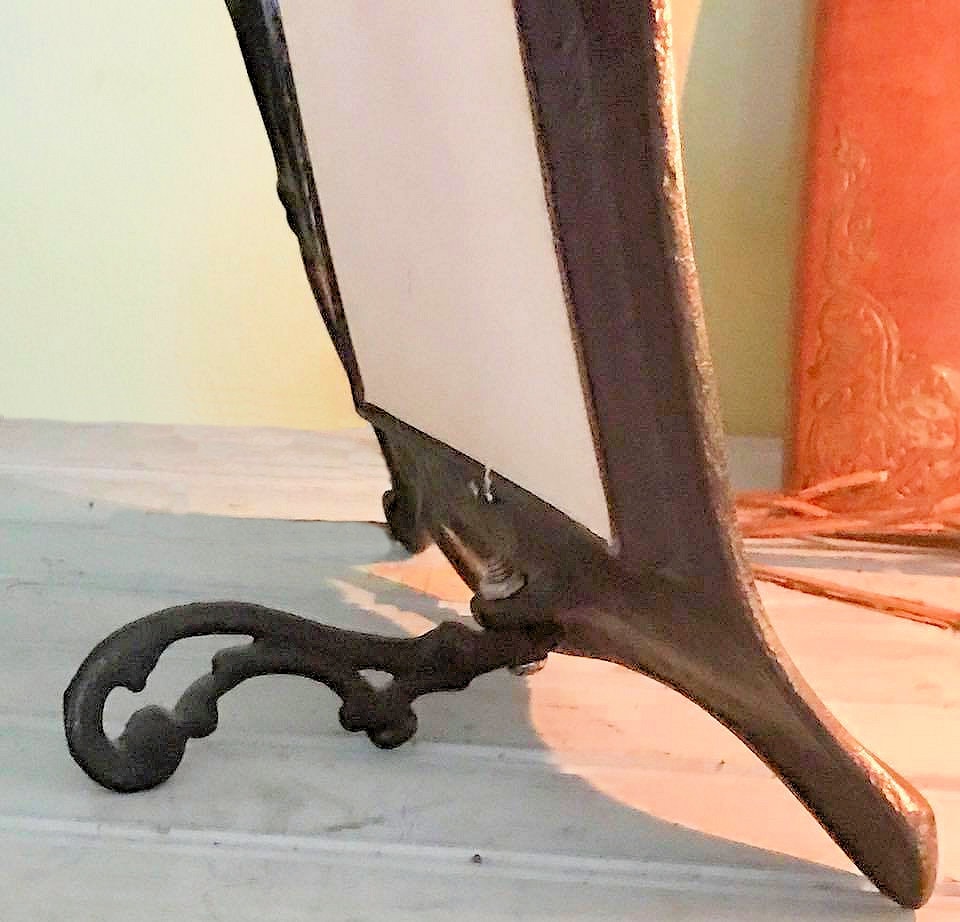 This is a beautiful scrying mirror that I have crafted from a Victorian Art Nouveau large cast iron mirror. The cast iron has a copper wash. It is in excellent shape for its age and still has the original foot for sitting. It features a young girl looking into the blackness of the mirror, standing amongst flowers and vine.